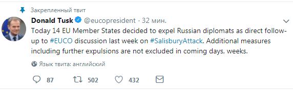 "Сегодня 14 стран ЕС решили изгнать российских дипломатов после обсуждения проишествия с отравлением в британском Солсбери. Мы не исключаем введение дополнительных мер, включая дальнейшие высылки в ближайшие дни, недели", - написал Туск в микроблоге.