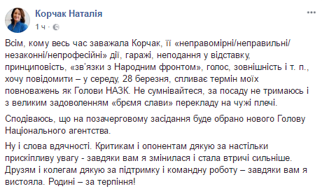 Председатель Национального агентства по предупреждению коррупции (НАПК) Наталья Корчак заявляет об истечении ее полномочий в среду, 28 марта, и о готовности передать руководство госагентством.
