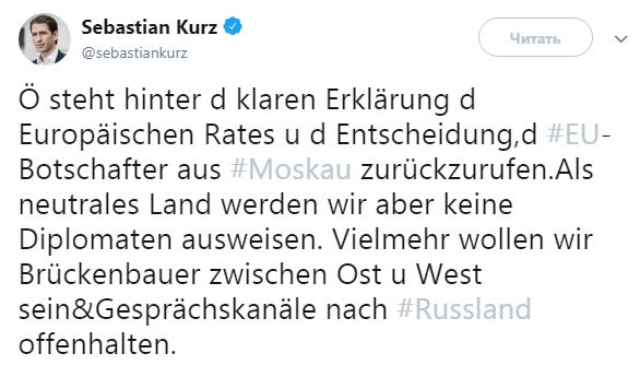 "Мы поддерживаем четкое заявление Европейского совета и решение отозвать главу делегации ЕС в РФ Москвы. Но как нейтральная страна мы не будем высылать дипломатов", - написал Курц в понедельник.