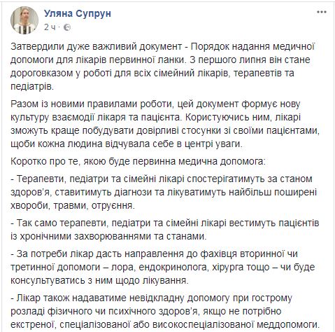 Об этом исполняющая обязанности министра здравоохранения Ульяна Супрун написала на своей странице в Facebook.
