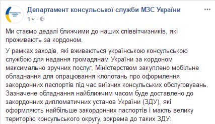 "В рамках мер, принимаемых украинской консульской службой для предоставления гражданам Украины за рубежом максимально удобных услуг, Министерством закуплено мобильное оборудование для обработки ходатайств об оформлении загранпаспортов во время выездных консульских обслуживаний", - говорится в сообщении.