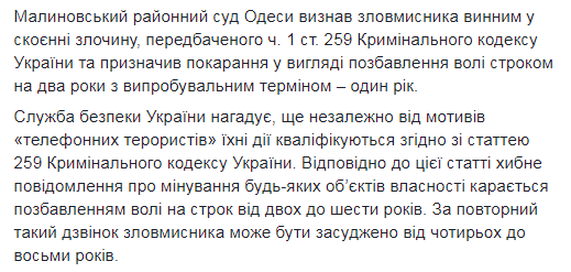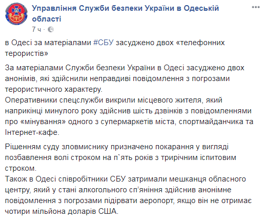 Также по материалам СБУ был осужден еще один телефонный хулиган, который в конце 2017 года совершил шесть звонков с сообщениями о ложном минировании одного из супермаркетов Одессы, спортплощадки и интернет-кафе. Он получил наказание в виде лишения свободы сроком на 5 лет с трехлетним испытательным сроком.