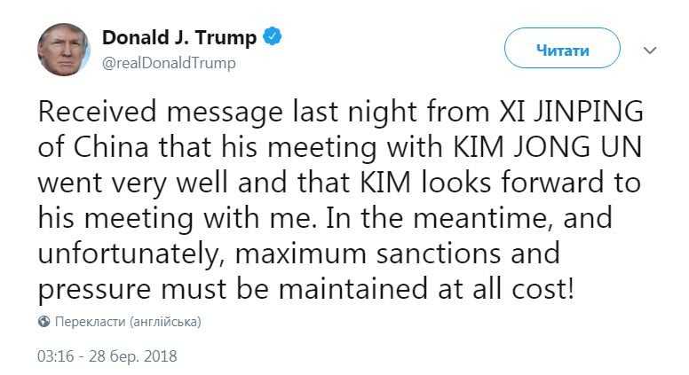 "Получил сообщение прошлой ночью от (главой КНР - Прим.Ред.) Си Цзиньпина из Китая, его встреча с Ким Чен Ыном прошла очень хорошо, и Ким надеется на его встречу со мной. Между тем, к сожалению, максимальные санкции и давление должны поддерживаться любой ценой!", — подчеркнул Дональд Трамп.