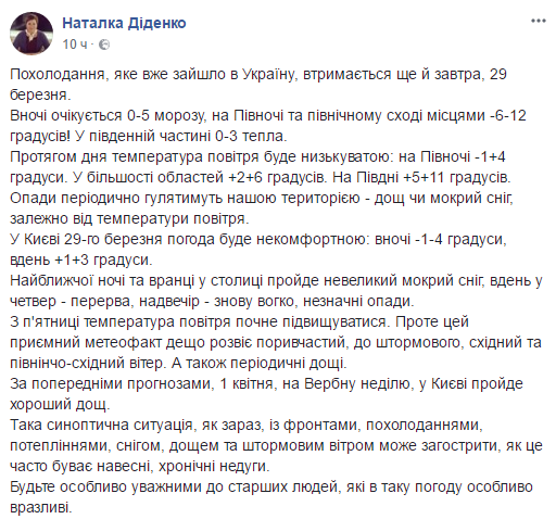 Синоптик Наталья Диденко сообщила, что похолодание, которое уже зашло в Украину, удержится еще и завтра, 29 марта.