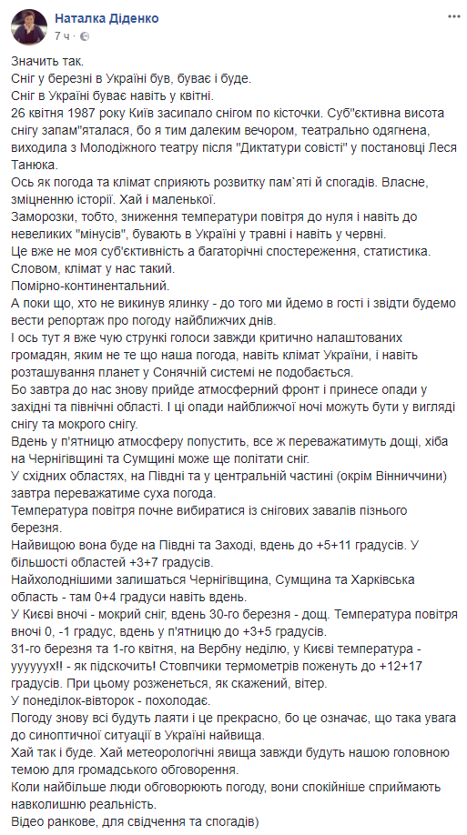 "Снег в марте в Украине был, бывает и будет. Снег в Украине бывает даже в апреле", успокаивает сограждан синоптик Наталья Диденко у себя в Facebook.