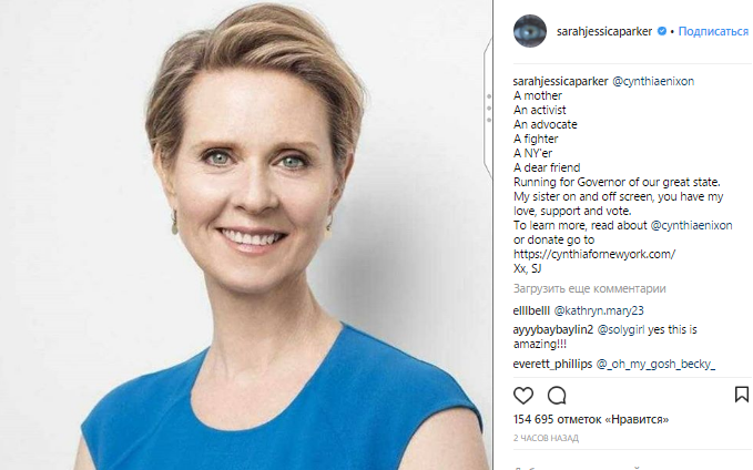 "Мама. Активист. Адвокат. Боец. Нью-Йорк. Дорогой друг. Та, что бежит за губернатором нашей великой державы. Моя сестра на экране, ты имеешь мою любовь, поддержку и голос", - написала Паркер и подкрепила свой пост фотографией Синтии Никсон.