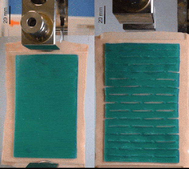 Ученые измеряли, насколько сильно может растянуться пленка перед тем, как начнет отслаиваться от поверхности. В результате команда Чжао заметила, что скорость высвобождения энергии в материале неоднородна: когда исследователи тянули его в разные стороны, то отслаивалась в первую очередь середина, а края оставались надежно приклеенными.