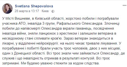 В городе Вишневое Киевской области трое мужчин напали на ветерана АТО Александра Рафальского, избили его и ограбили — забрали кошелек, удостоверение инвалида войны, сняли цепочку с крестиком.