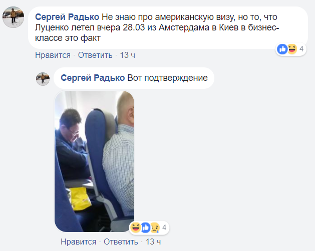 "Не знаю про американскую визу, но то, что Луценко летел 28.03 из Амстердама в Киев в бизнес-классе это факт", - написал Радько в комментариях к посту нардепа Дмитрия Добродомова, который также озвучивал информацию об аннулировании американской визы для генпрокурора.