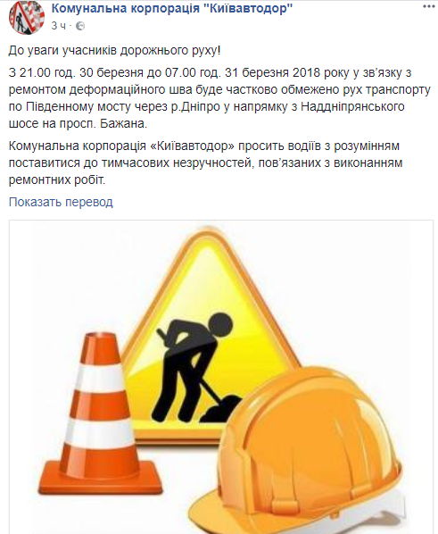 "С 21:00 30 марта до 07:00 31 марта 2018 в связи с ремонтом деформационного шва будет частично ограничено движение транспорта по Южному мосту через Днепр в направлении с Надднепрянского шоссе на проспект Бажана", - говорится в сообщении.