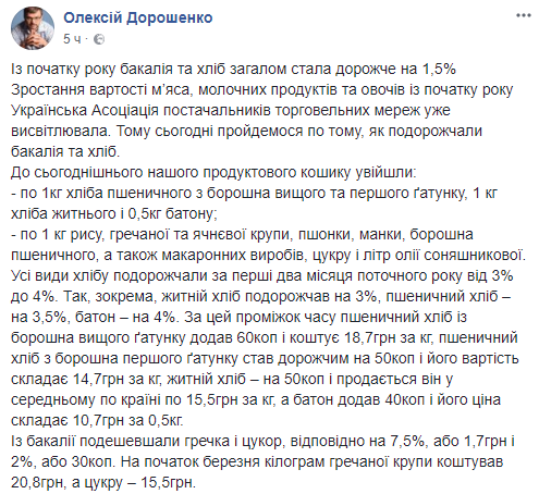 Бакалейная корзина украинца в начале года стоила 213,4 грн, а за два месяца - 216,7 грн. То есть хлеб и бакалея вместе подорожали на 3,3 грн, или 1,5%", - подытожил Дорошенко.