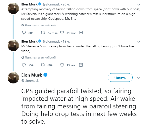 Маск сообщил, что специалисты установили, что причиной крушения стало нераскрытое парашютирующее крыло. С его помощью ракета-носитель должна была спокойно приводниться, но этого не произошло.