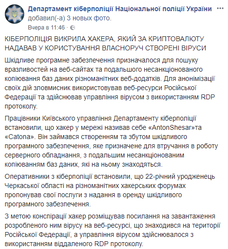 Украинские киберполицейские задержали хакера, который сдавал в аренду вирусы, которые сам же и создавал. Об этом сказано на странице Киберполиции в Facebook.
