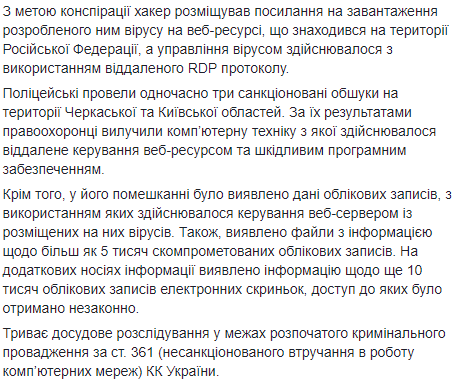 Свою преступную деятельность хакер скрывал, используя ресурсы Российской Федерации и осуществлял управление вирусной программой с помощью RDP протокола. Так, украинец размещал вирусы для скачивания на сайтах, которые были зарегистрированы в России.