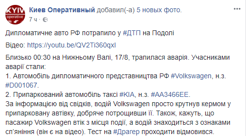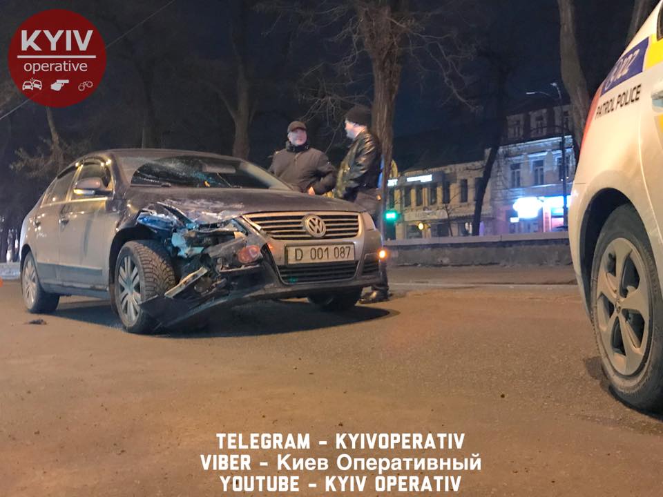 ДТП произошло около 00:30 на Нижнем Валу, 17/8. Так, машина дипломатического представительства РФ Volkswagen с госномером D001067 врезалась в припаркованное такси KIA.