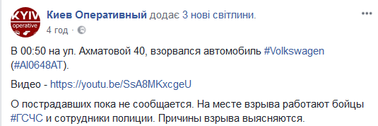 Сегодня, в ночь на 2 апреля, в Киеве снова прозошло громкое ЧП. На улице Ахматовой прогремел сильный взрыв. Там взорвался автомобиль. Об этом сообщает "Киев Оперативный" на официальной странице в Facebook.