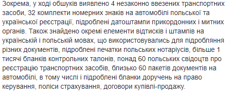 "После формирования доказательной базы на завершающей стадии документирования проведены обыски в частных хозяйствах Любомльского района Волынской области, а это - 7 фигурантов дела. Как результат, полностью подтверждена преступная деятельность и изъято еще ряд транспортных средств и большое количество вещей и предметов, которые будут использованы в качестве доказательств в суде", - говорится в сообщении.