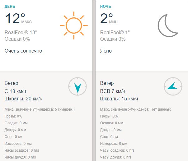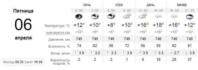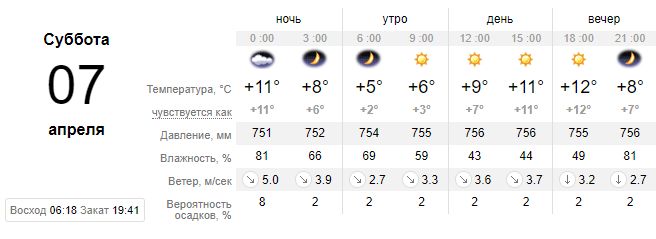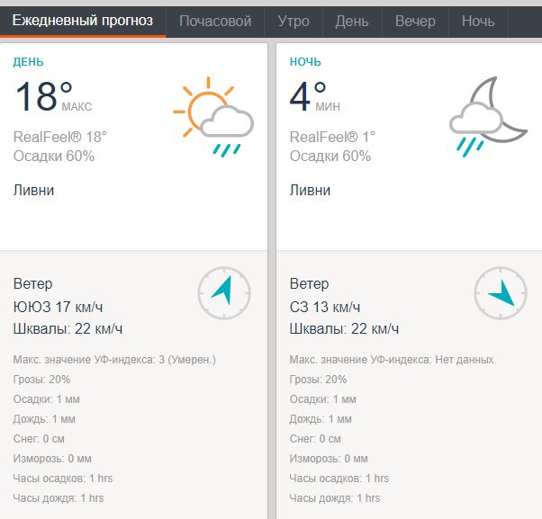 Сайт Accuweather также предполагает дождь. Ночью прогнозируют всего 4 градуса тепла, зато днем до 18.