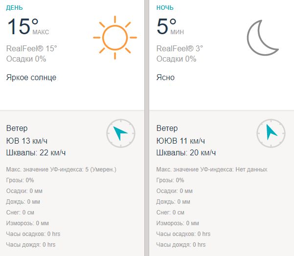 AccuWeather в прогнозах еще оптимистичнее и предполагает 15 градусов тепла. Ясно, без осадков.