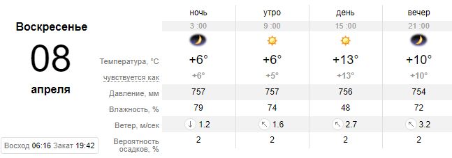 В столице "Синоптик" обещает в этот день солнечную погоду без осадков, температура от 6 градусов тепла утром до 13 днем.