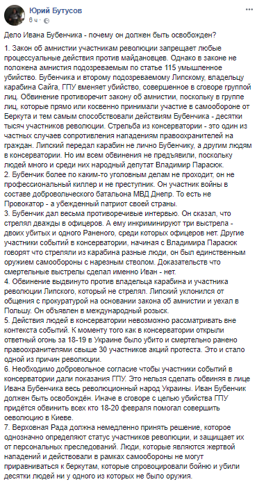 Стрельба из консерватории – это один из частных случаев сопротивления нападениям правоохранителей на граждан. Липский передал карабин не лично Бубенчику, а другим людям в консерватории. Но им всем обвинения не предъявили, поскольку людей много и среди них народный депутат Владимир Парасюк", – пишет Бутусов.