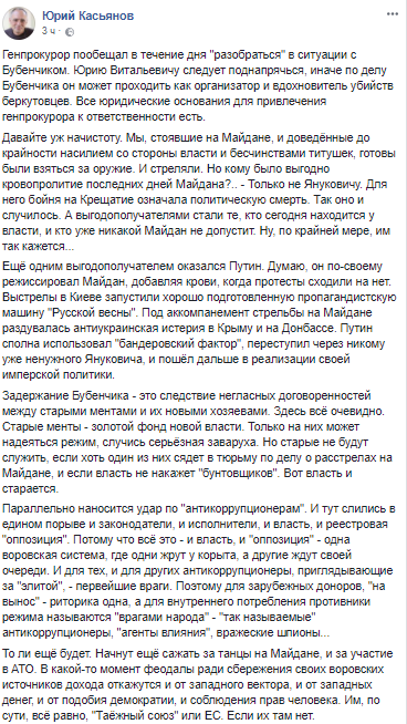 Глава института Нацпамяти Владимир Вятрович также считает, что результат "дела Бубенчика" может вернуть Украину в прошлое. Попутно в своем посте Вятрович прямо утверждает, что майдановец убил несколько милиционеров. Но предлагает списать это на "революционную необходимость".