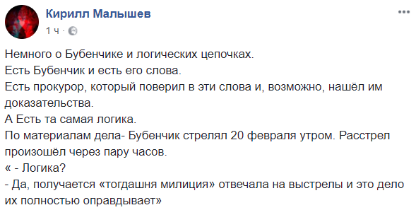 "По материалам дела – Бубенчик стрелял 20 февраля утром. Расстрел (протестующих. –Прим Ред.) произошел через пару часов. ... Получается "тогдашняя милиция" отвечала на выстрелы, и это дело их полностью оправдывает".