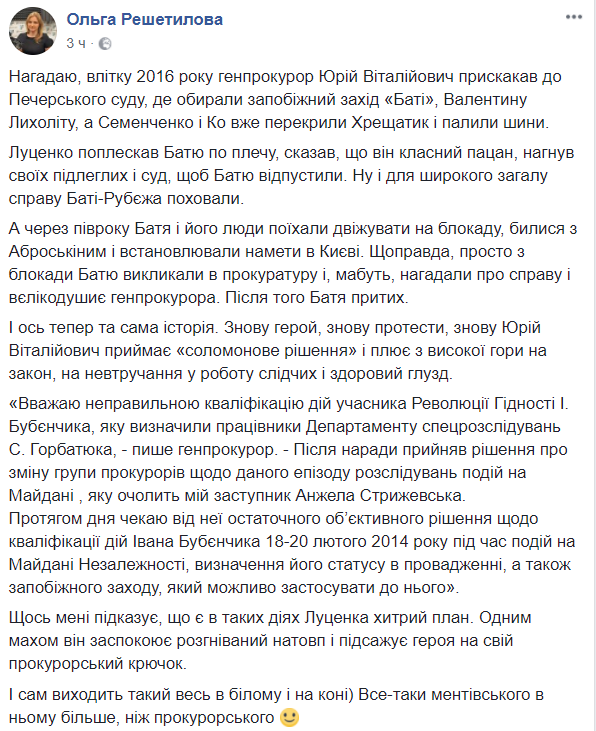 И вот теперь та же история. Опять герой, снова протесты, снова Юрий Витальевич принимает "соломоново решение" и плюет с высокой горы на закон, на невмешательство в работу следственных и здравый смысл", – реагирует на заявление Луценко журналистка Ольга Решетилова.