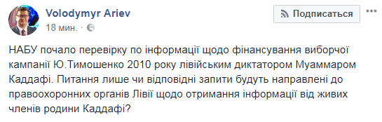 НАБУ начала проверку информации о финансировании Каддафи избирательной компании Тимошенко - Арьев