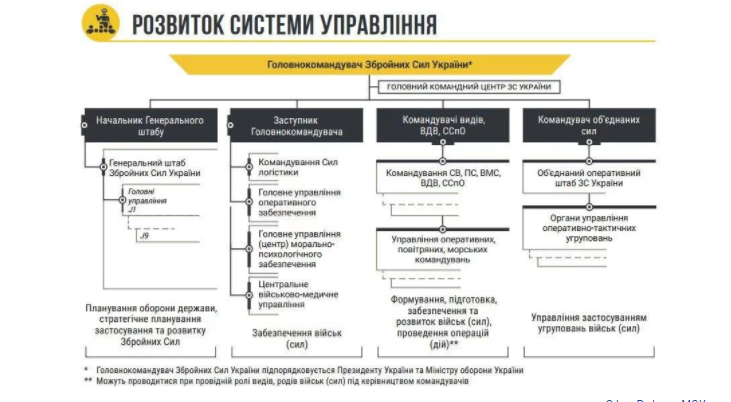 Отдельно функционирует Оперативный штаб с командующим объединенных сил во главе, причем командующий объединенных сил также подчиняется главнокомандующему ВСУ.