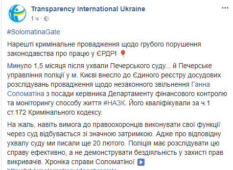 "Прошло 1,5 месяца после определения Печерского суда... и Печерское управление полиции в г. Киеве внесло в Единый реестр досудебных расследований производства относительно незаконного освобождения Анны Соломатиной с должности руководителя Департамента финансового контроля и мониторинга образа жизни НАПК", - пишет организация.