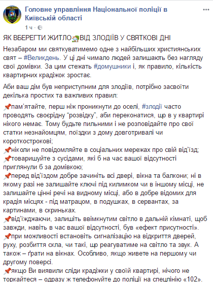 В праздничные дни Пасхи многие оставляют без присмотра свои дома и, как правило, количество квартирных краж возрастает. Об этом говорится в сообщении Нацполиции в Facebook.