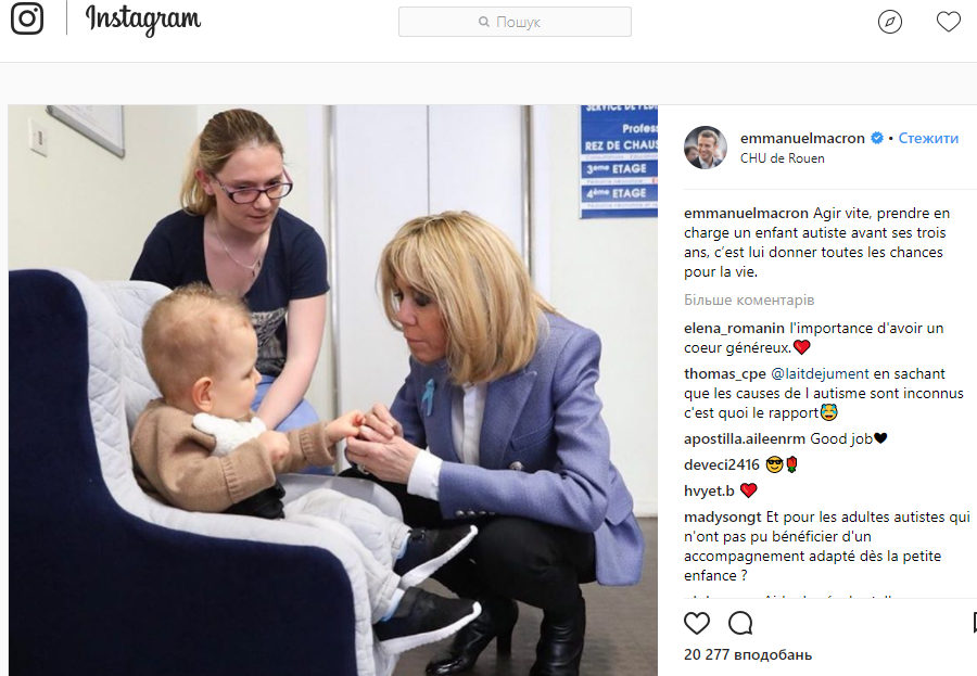 На встречу Бриджит прибыла в сопровождении своего мужа. В больнице в Нормандии президент Эммануэль Макрон представил план по предоставлению образовательных услуг и ухода за людьми, живущими с аутизмом.