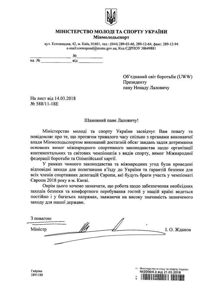 Жданов заявил, что Украина не получала никаких официальных претензий или предупреждений о невозможности проведения чемпионата Европы среди кадетов по борьбе. И подготовка к соревнованиям шла по ранее наработанному плану.