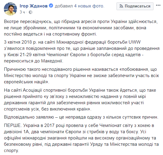 Министр молодежи и спорта Игорь Жданов назвал перенос из Киева в Скопье чемпионата Европы по спортивной борьбе - "местью Украины за бойкот международных соревнований в России".