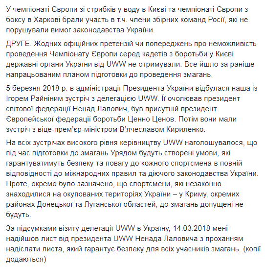 “На всех встречах высокого уровня руководству UWW отмечалось, что во время подготовки к соревнованиям правительством будут созданы условия, гарантирующие безопасность и уважение к каждому спортсмену в полном соответствии с международными правилами и действующим законодательством Украины. Однако отдельно было отмечено, что спортсмены, которые незаконно находились на оккупированных территориях Украины — в Крыму, отдельных районах Донецкой и Луганской областей, к соревнованиям допущены не будут”, - отметил Жданов.