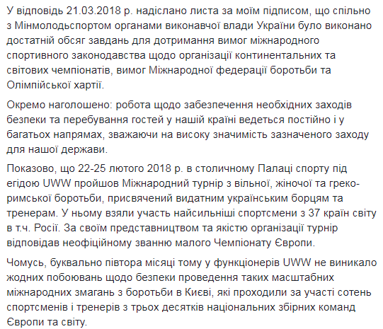 Он отметил, что заявленные причины переноса соревнований — "опасения, что Министерство молодежи и спорта Украины не сможет обеспечить участие всех европейских наций” и “невозможность предоставления в полной мере государственных гарантий для обеспечения равных возможностей участия спортсменов всех без исключения стран" - неправда.