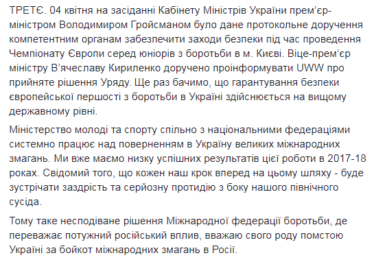 "...Такое неожиданное решение (о переносе чемпионата Европы среди кадетов из Киева — Прим.Ред.) Международной федерации борьбы, где преобладает мощное российское влияние, считаю своего рода местью Украины за бойкот международных соревнований в России", - заявил Жданов.