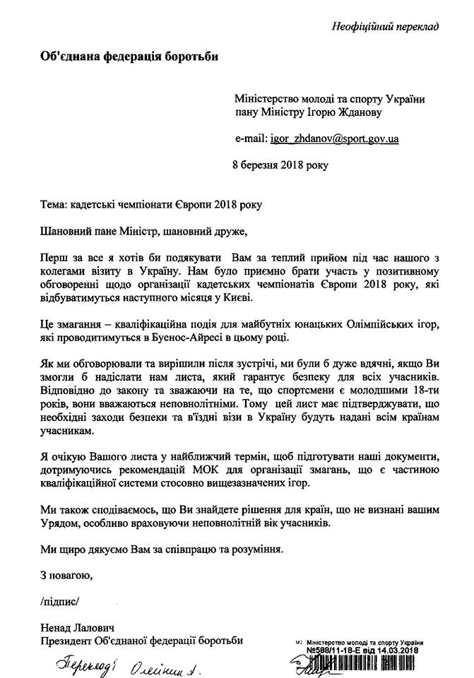 Министр также обнародовал переписку с президентом федерации борьбы Нанадом Лаловичем по подготовке соревнований и обеспечения безопасности.