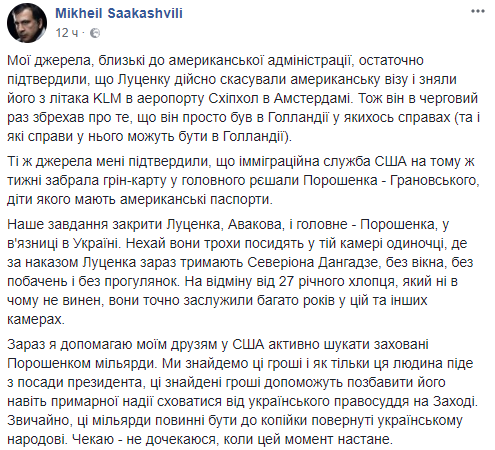 Те же источники мне подтвердили, что иммиграционная служба США на той же неделе забрала грин-карту у главного решалы Порошенко - Грановского, дети которого имеют американские паспорта", - написал Саакашвили.