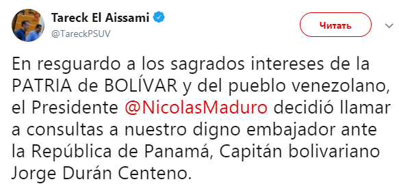 Венесуэла уже ответила на предложение Панамы о высылке послов. Президент страны Николас Мадуро 6 апреля отозвал посла из Панамы для консультаций.