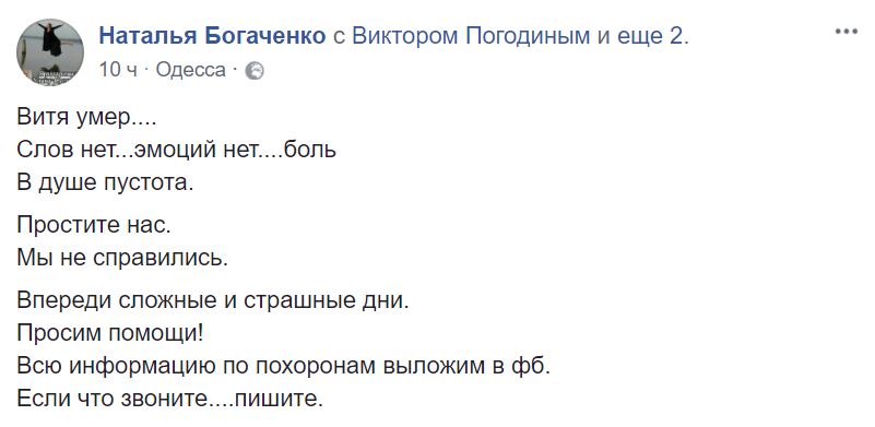 Погодин совершил 39 поездок в зону АТО. А в конце марта попал в больницу с желудочным кровотечением. Волонтеру сделали операцию и обследовали в киевской клинике рака. Ему нужна была пересадка печени. Знакомые и все неравнодушные собрали средства на лечение Погодина, однако болезнь победила.