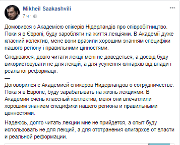 Лишенный украинского гражданства экс-губернатор Одесской области, лидер движения "Рух новых сил" Михаил Саакашвили, которому накануне Пасхи привезли из Украины сало, грибы и самогон, рассказал о трудоустройстве в качестве лектора в Академии спикеров в Нидерландах. Об этом он написал на своей странице в Facebook.