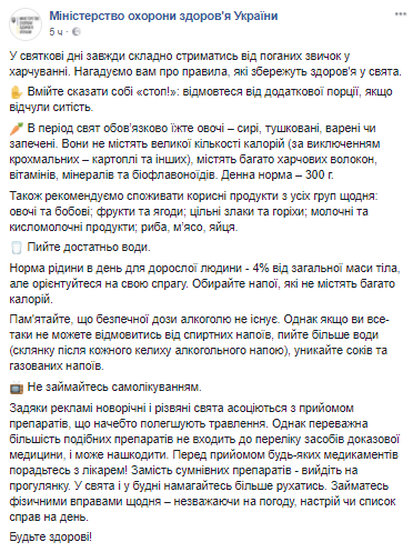 В Минздраве опубликовали предостережения и советы в вопросах питания в праздничные дни. Об этом сообщают на странице ведомства в Facebook.