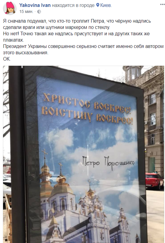 09:27  В Сети продолжают обсуждать пасхальные биг-борды Порошенко. "Теперь мы знаем, кому мы обязаны воскресением", - иронизирует адвокат Татьяна Монтян.