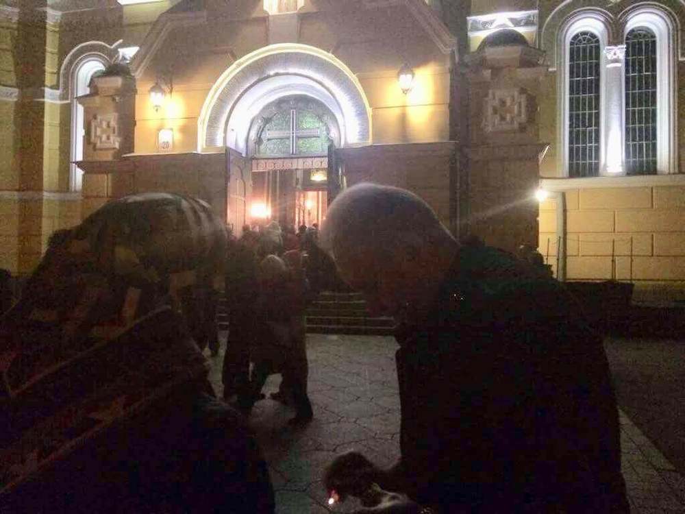 08:00  Президент Петр Порошенко в пасхальную ночь приехал помолиться в три церкви. Сначала во Владимирском соборе УПЦ КП, где он встретил собственно Пасху.
