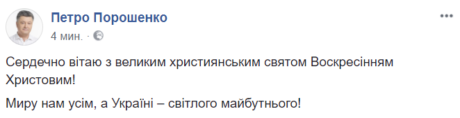 Президент Петр Порошенко: "Праздник Воскресения Христова мы празднуем все вместе. Потому, напомню еще раз, как сказано в Священном Писании: один Господь, одна вера, одно крещение. Христос воскрес! Воистину воскрес!", - говорится в Пасхальном поздравлении президента.
