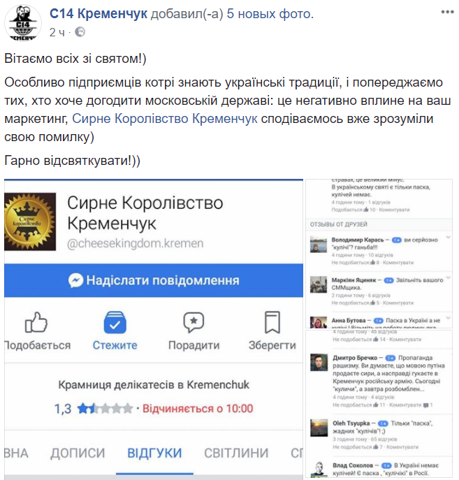 09:40  Радикалы из С-14 продолжают вредить владельцам торговых марок, которые использовали в названии слово "кулич". Они избрали тактику понижения им рейтинга в Facebook - массово заходят на брендовые страницы и ставят оценку 1 - сопровождая это характерными комментариями.