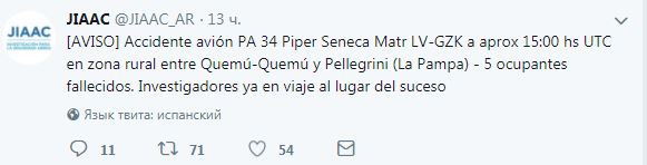Инцидент произошел с легкомоторным самолетом Piper PA-34 Seneca между городами Кума-Кума и Пеллегрини в провинции Ла-Пампа.