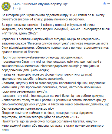 Помимо этого 11-13 апреля в северных и центральных районах Киевской области ожидается высокий (4 класса) уровень пожарной опасности, а в районе Чернобыля чрезвычайный (5 класса) уровень пожарной опасности.